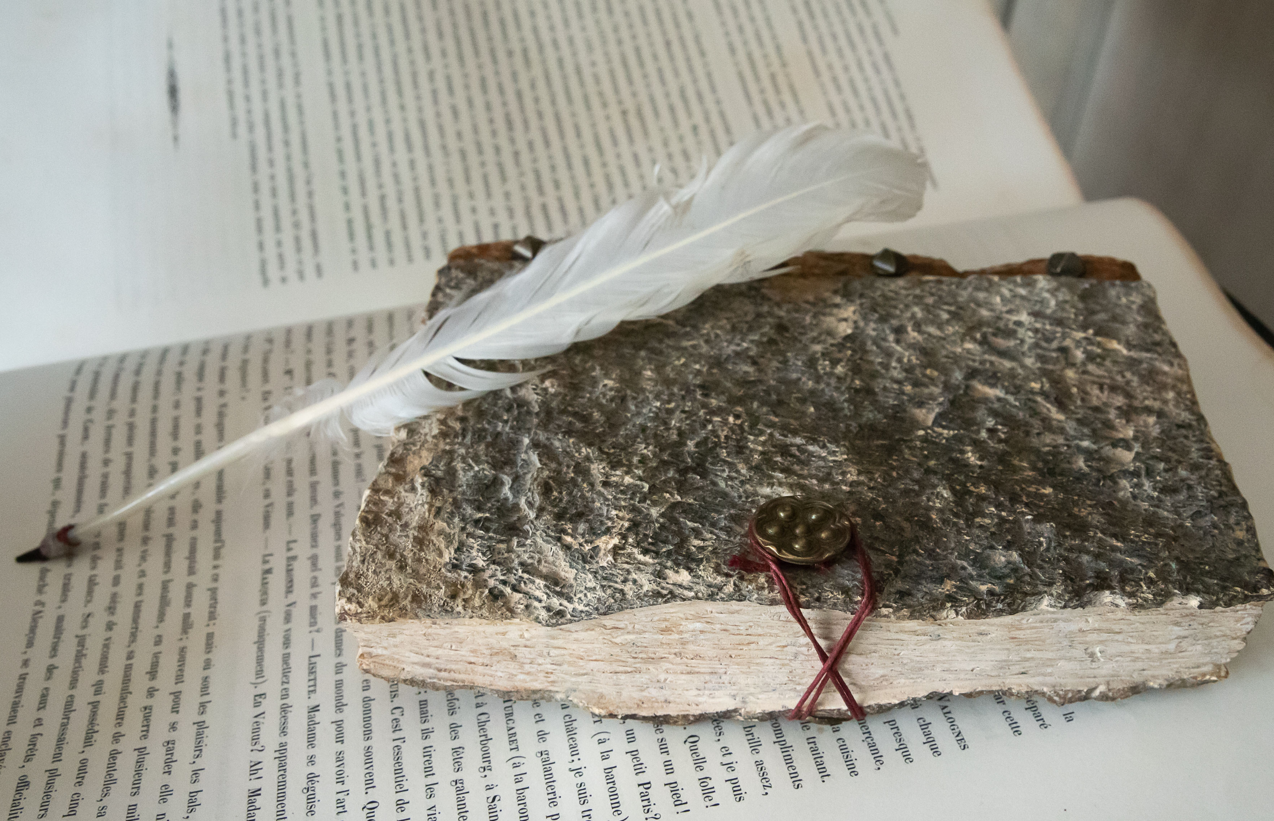 Pour réaliser des livres en pierre, imitant le cuir, j’utilise des procédés de texture spéciaux afin de recréer l’aspect chaleureux et sophistiqué du cuir, tout en conservant la durabilité de la pierre. Je commence par façonner la pierre pour obtenir une surface lisse ou légèrement texturée comme l’ardoise, puis j’applique des traitements de surface ou l’incision pour créer des motifs de grain et de nervure similaire à ceux du cuir naturel que l’on retrouve dans les livres anciens. J’utilise également des techniques de patine ou de coloration pour donner à la pierre des nuances riches et authentiques, renforçant ainsi l’effet du cuir. Ces procédés permettent de combiner l’élégance du cuir avec la solidité de la pierre, offrant un résultat unique, esthétique et durable.